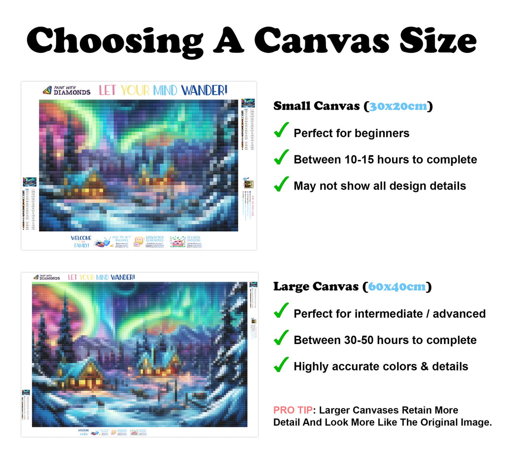 Large canvases show tiny details and all lettering, but may take up to 50+ hours to complete.