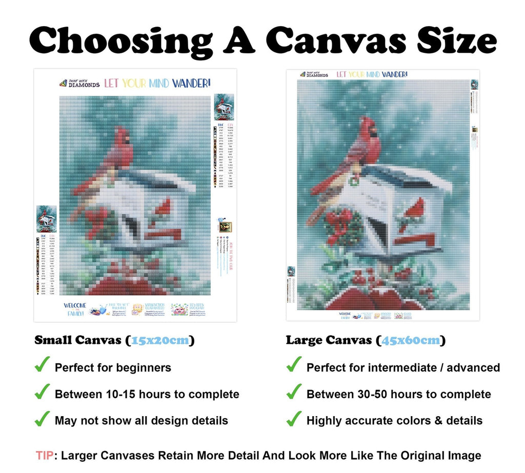 Feel the satisfaction of watching your Diamond Painting come together before your very eyes. This gorgeous artwork entitled "Christmas Cardinals" by artist Jenny Newland is now available as a Full Drill Diamond Painting Kit in your choice of Square or Round Diamonds.