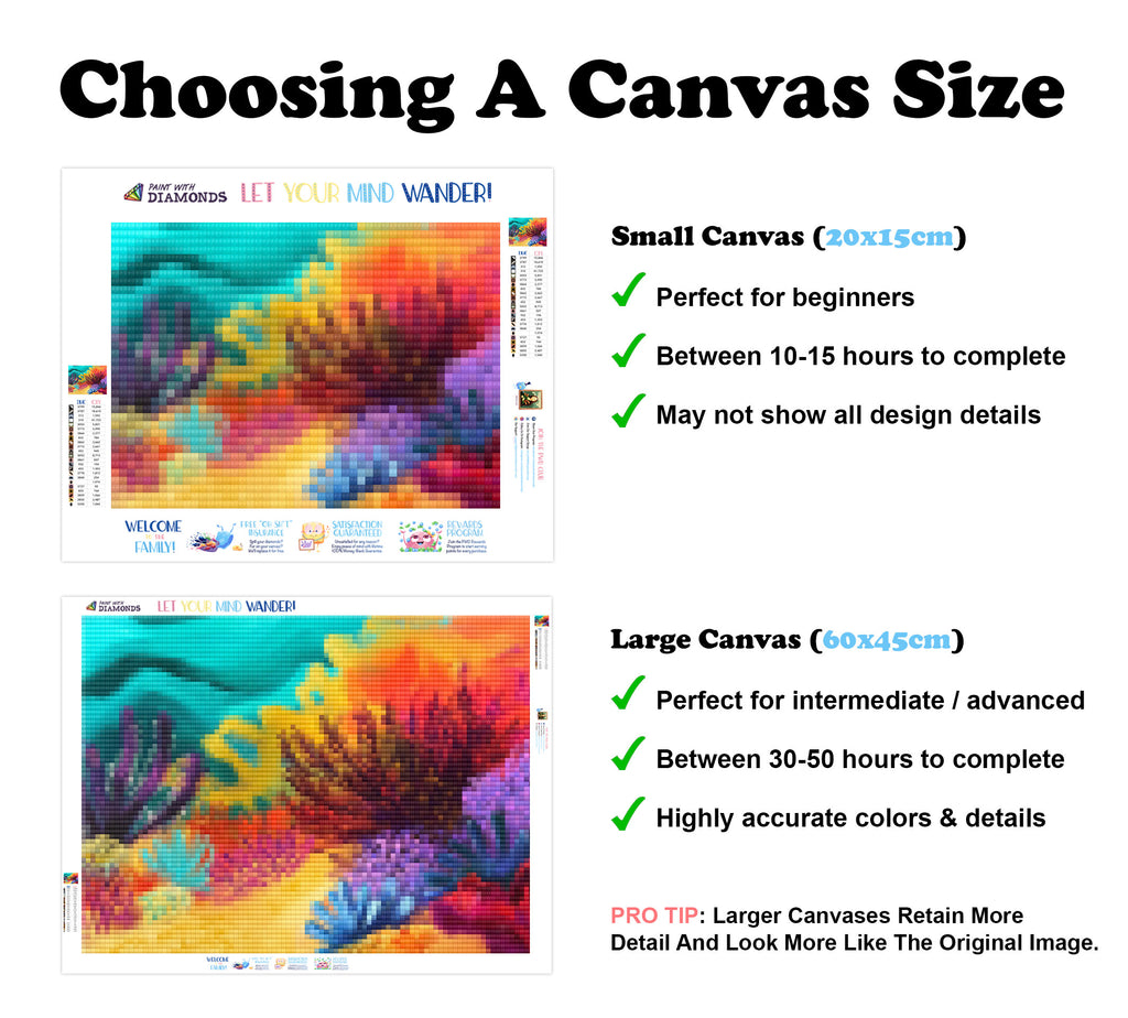 Large canvases show tiny details and all lettering, but may take up to 50+ hours to complete.