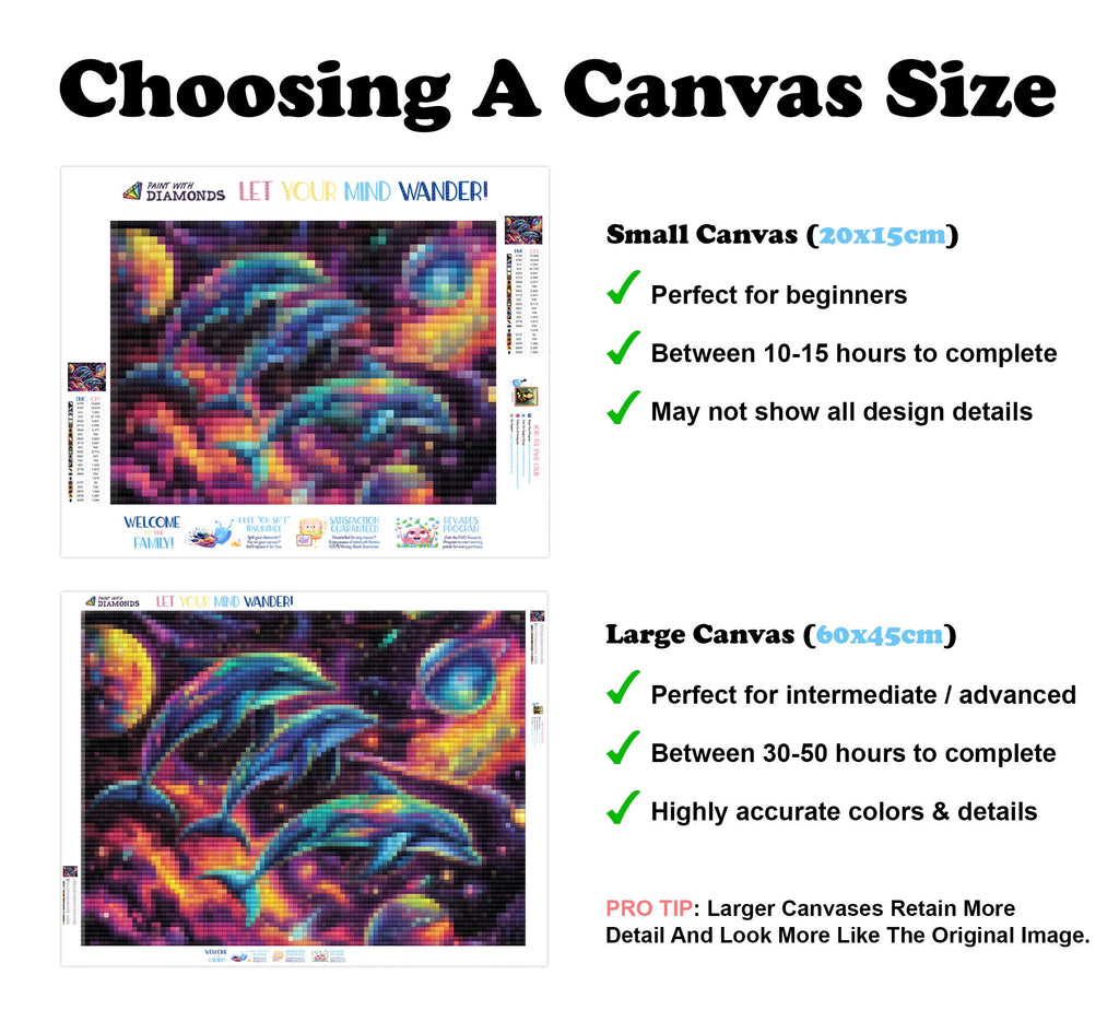 Large canvases show tiny details and all lettering, but may take up to 50+ hours to complete.