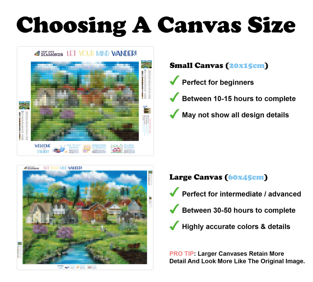 Large canvases show tiny details and all lettering, but may take up to 50+ hours to complete.