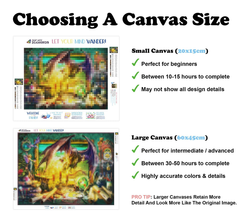 Large canvases show tiny details and all lettering, but may take up to 50+ hours to complete.