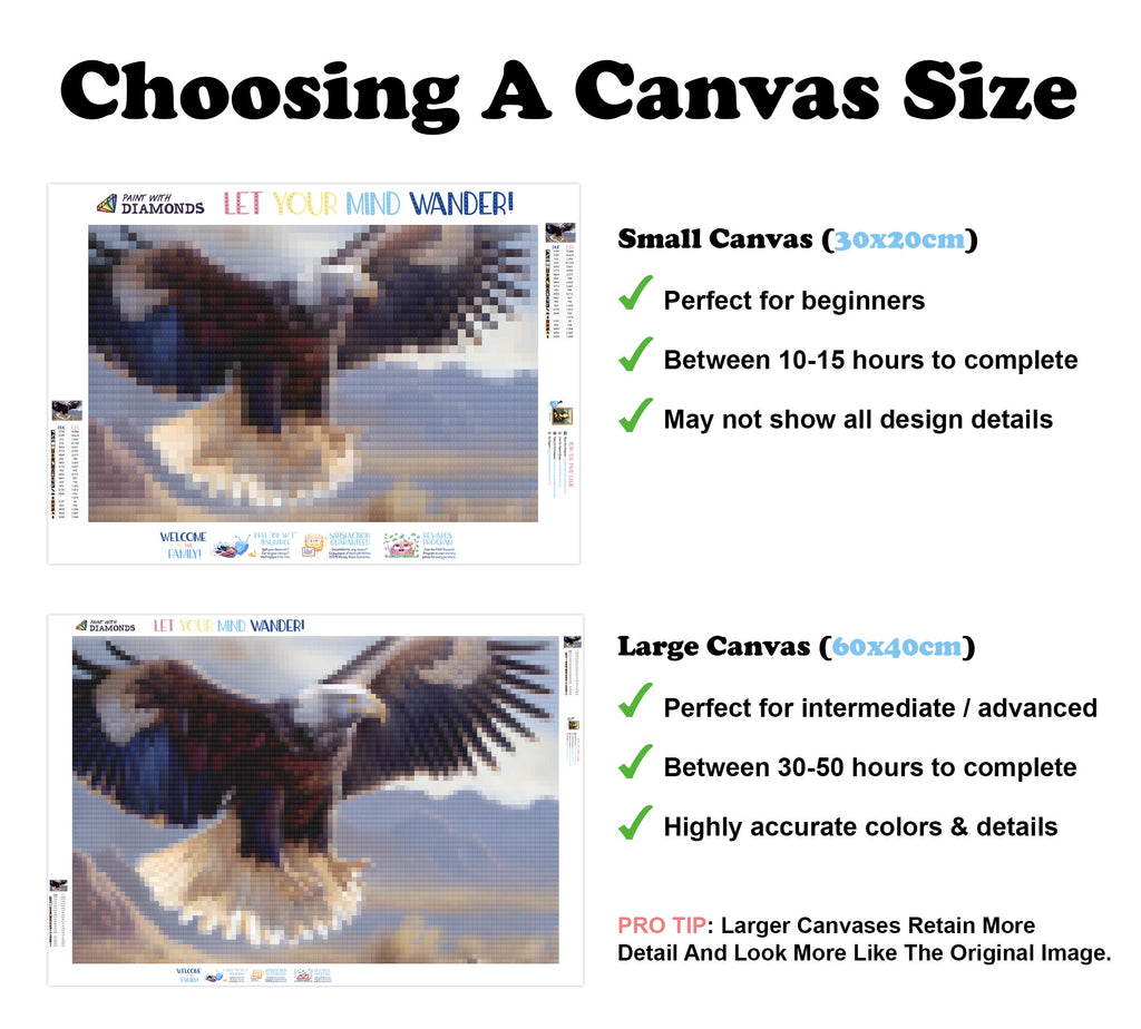 Large canvases show tiny details and all lettering, but may take up to 50+ hours to complete.