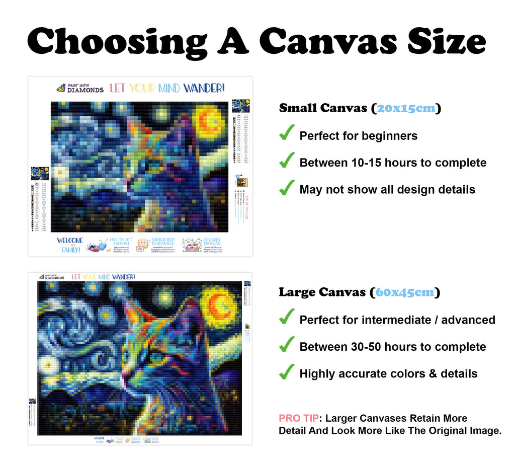 Large canvases show tiny details and all lettering, but may take up to 50+ hours to complete.
