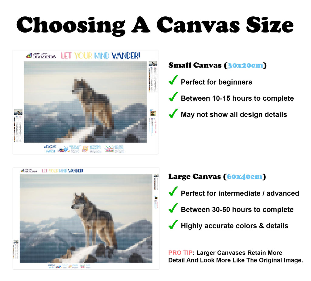 Large canvases show tiny details and all lettering, but may take up to 50+ hours to complete.