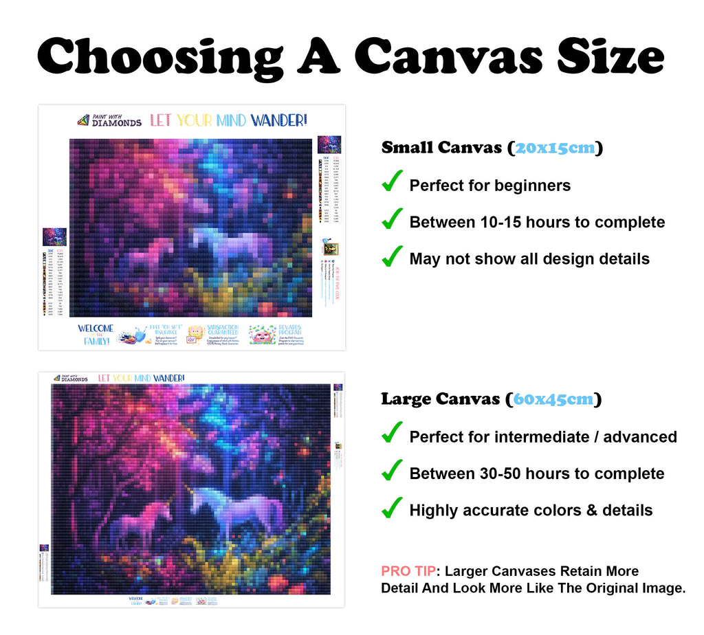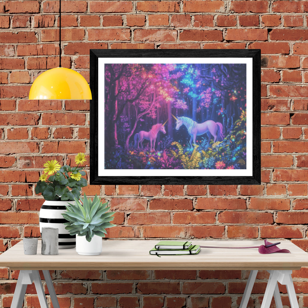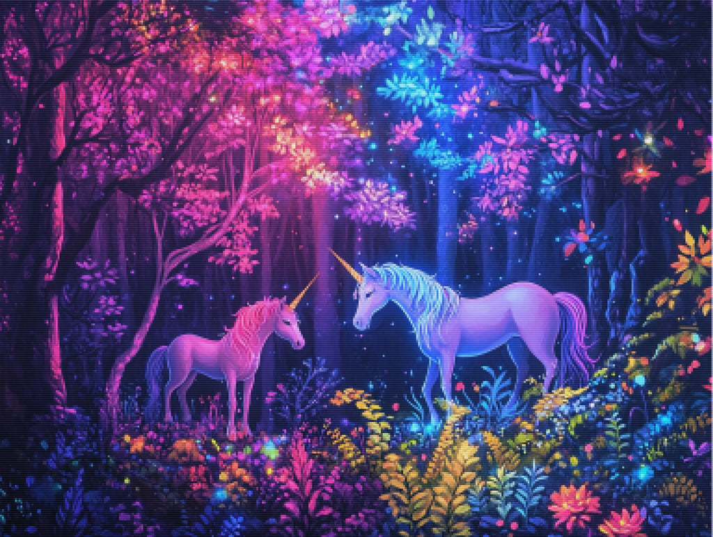 Escape into a world of vibrant colors and creative tranquility with the ‘Mystic Forest Unicorns’ Diamond Painting Kit. This exclusive full-drill design by artist Caleb Smith is available only at Paint With Diamonds. Let your mind unwind as you piece together shimmering diamonds to create a beautiful masterpiece.