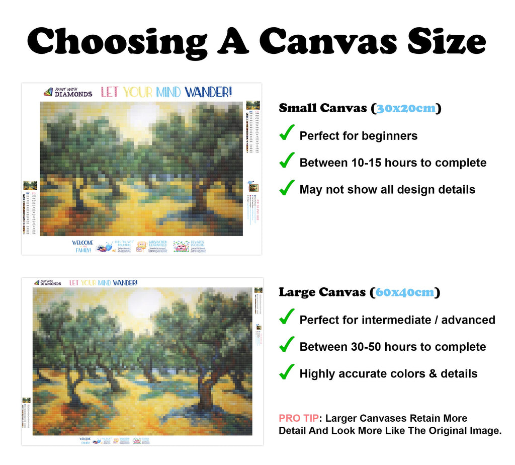 Large canvases show tiny details and all lettering, but may take up to 50+ hours to complete.