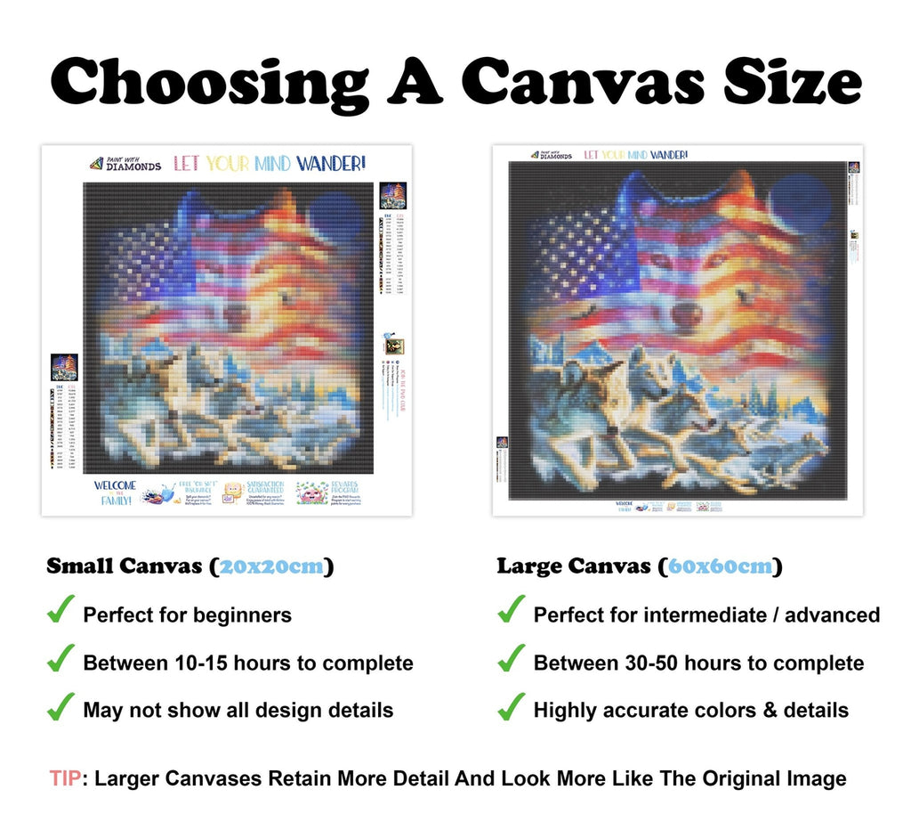 Large canvases show tiny details and all lettering, but may take up to 50+ hours to complete.