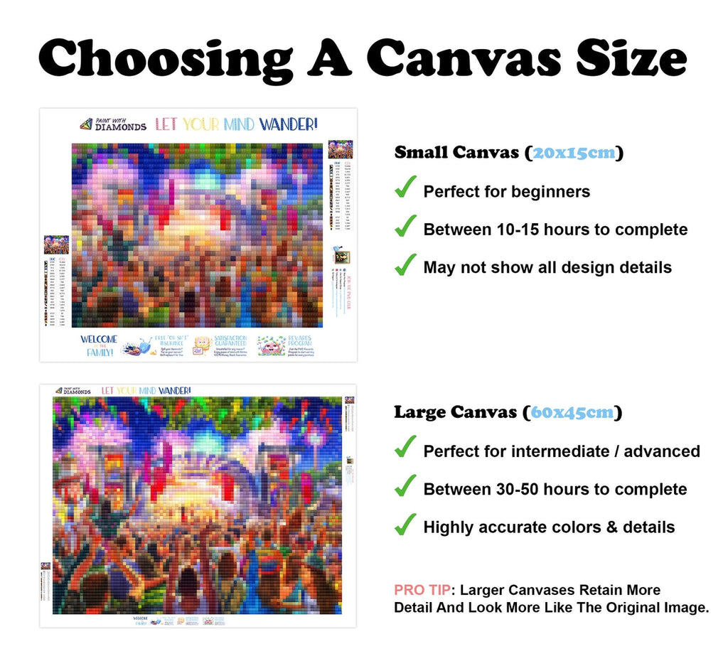 Large canvases show tiny details and all lettering, but may take up to 50+ hours to complete.