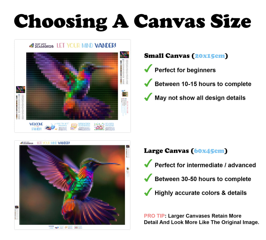 Large canvases show tiny details and all lettering, but may take up to 50+ hours to complete.