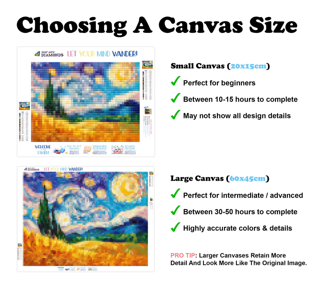 Large canvases show tiny details and all lettering, but may take up to 50+ hours to complete.