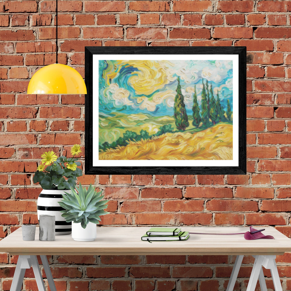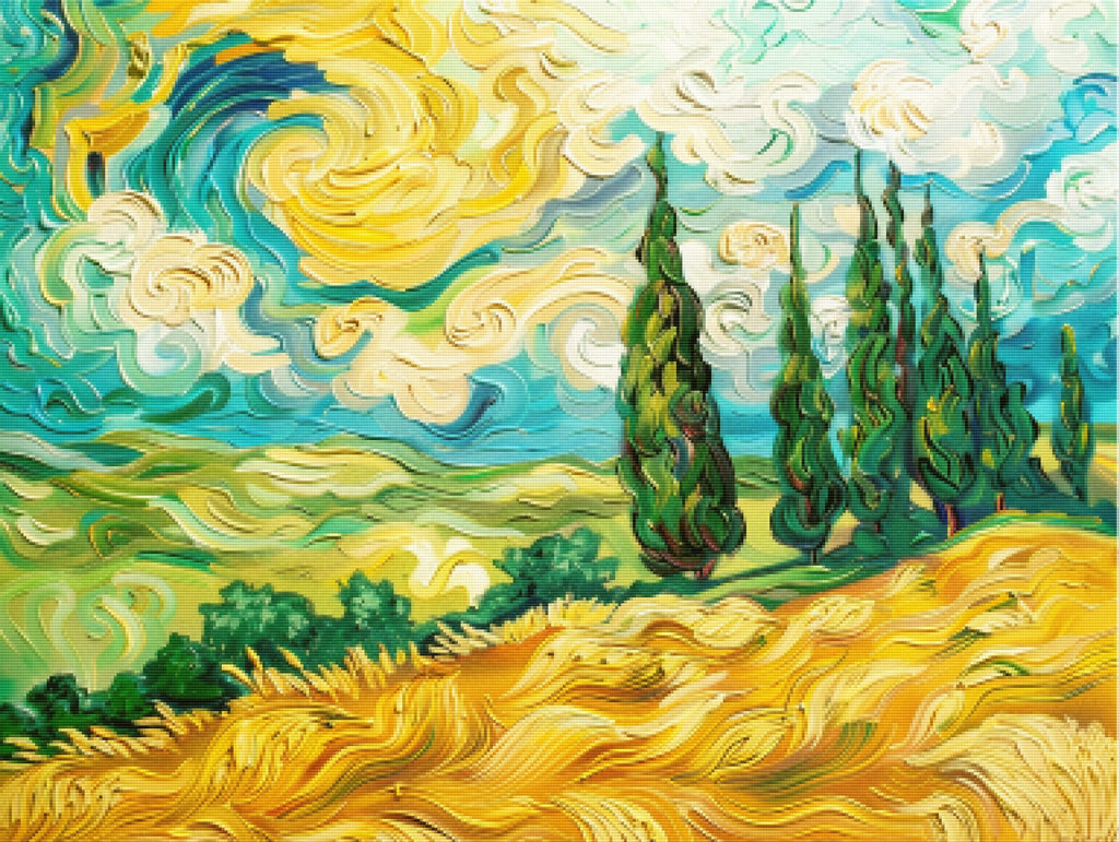 Ready to relax and create something beautiful? Add the 'Vibrant Wheat Field with Cypresses Diamond Painting Kit to your cart today and start your journey to creative calm.