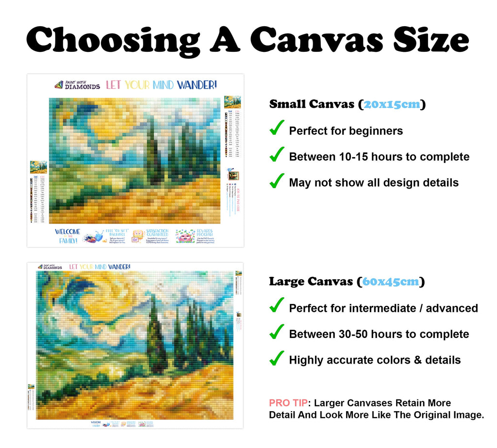 Escape into a world of vibrant colors and creative tranquility with the ‘Vibrant Wheat Field with Cypresses’ Diamond Painting Kit. This exclusive full-drill design by artist Caleb Smith is available only at Paint With Diamonds. Let your mind unwind as you piece together shimmering diamonds to create a beautiful masterpiece.