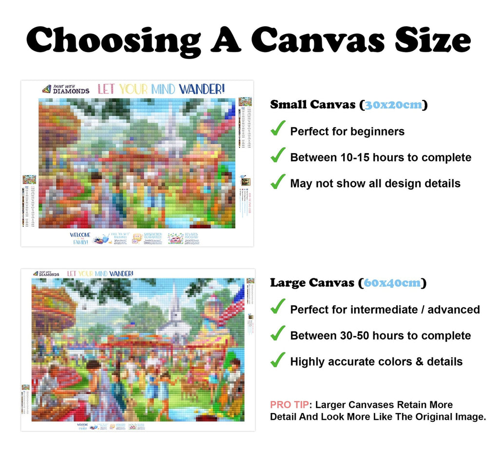 Large canvases show tiny details and all lettering, but may take up to 50+ hours to complete.